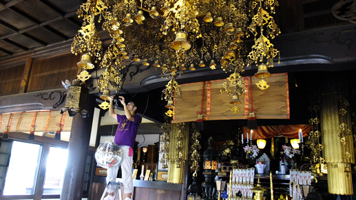 ご本尊のまわりにミラーボールを吊るしていく。