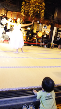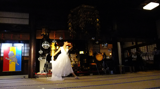 お寺でクラシックの音色にダンスという、なんともシュールな情景。