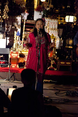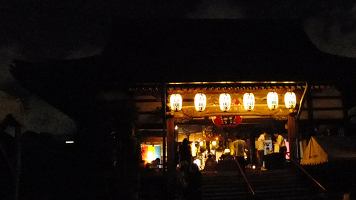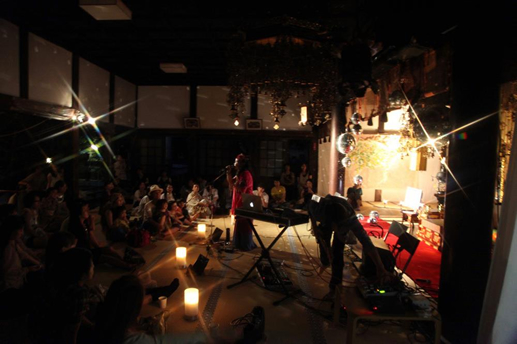 夜の闇につつまれた本堂の中、不動明王の視線の中で奏でられる岡山さんの音楽。